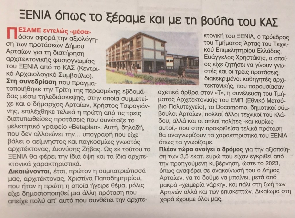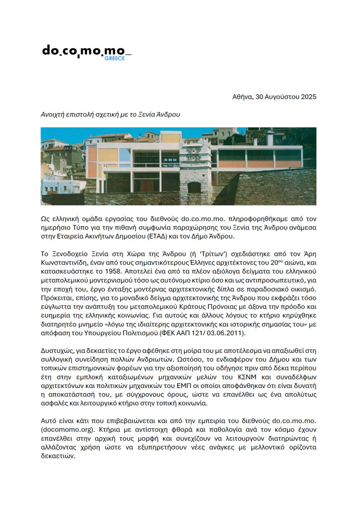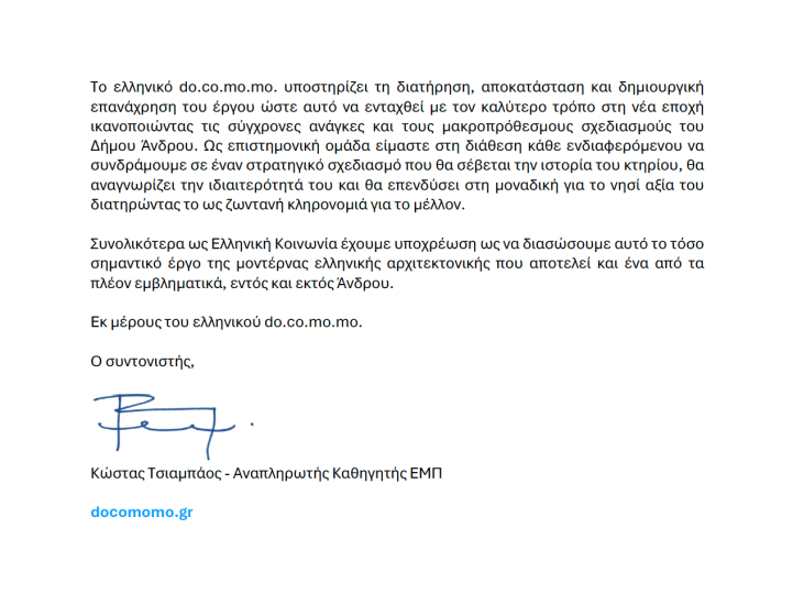 | Eπιστολή στον Πρωθυπουργό 11 Οργανώσεων για το πρόγραμμα ΔΙΑΤΗΡΩ Προς τον Πρωθυπουργό της Ελληνικής Δημοκρατίας,κύριο Κυριάκο Μητσοτάκη Αξιότιμε κύριε Πρωθυπουργέ, Όλες οι πόλεις και οι οικισμοί μας, αλλά και η ύπαιθρος διαθέτουν έναν σπάνιο αρχιτεκτονικό πλούτο, ανεκτίμητη μαρτυρία του παρελθόντος και χαρακτηριστική εικόνα της Ελλάδας. Η ανάγκη προστασίας της αρχιτεκτονικής κληρονομιάς είναι επιτακτική για πολλούς λόγους, ιστορικούς, αρχιτεκτονικούς, αισθητικούς, διατήρησης της ταυτότητας, της υψηλής ποιότητας ζωής που προσφέρουν, αλλά και οικονομικούς. Είναι αναγνωρισμένη διεθνώς η οικονομική αξία των ιστορικών κτηρίων λόγω της σημαντικής τους συμβολής στη βιώσιμη ανάπτυξη και στην ανάπτυξη του τουρισμού. Τα ιστορικά κέντρα, τα ιστορικά σύνολα και γενικά όλα τα ιστορικά αξιόλογα κτήρια προσελκύουν επισκέπτες από όλο τον κόσμο, οι οποίοι είναι διατεθειμένοι να πληρώσουν ένα υψηλό κόστος ταξιδιού και διαμονής για να τα επισκεφθούν, δημιουργώντας ταυτόχρονα αντίστοιχες οικονομικές ροές, απασχόληση, εισόδημα και οικονομική ανάπτυξη. Πολλά από τα ιστορικά ακίνητα, διατηρητέα και μη, λόγω της φθοράς του χρόνου και της έλλειψης συντήρησης, έχουν περιέλθει σε κακή κατάσταση διατήρησης. Οι ιδιοκτήτες τους τις περισσότερες φορές αδυνατούν να τα συντηρήσουν και αποκαταστήσουν, γεγονός που τα οδηγεί σε εγκατάλειψη και επιδείνωση της στατικής τους επάρκειας σε βαθμό που καταλήγουν επικίνδυνα για την ανθρώπινη ζωή. Χαρακτηριστικό παράδειγμα αποτελεί το τραγικό γεγονός απώλειας ζωής δύο νέων παιδιών στη Σάμο το 2021, από κατάρρευση επικίνδυνου κτηρίου. Παράλληλα, η εγκατάλειψη των κτηρίων ιδιαίτερα στα αστικά κέντρα έχει ως αποτέλεσμα την αλλοίωση της φυσιογνωμίας ολόκληρων περιοχών που γειτνιάζουν με αυτά. Χαρακτηριστικό παράδειγμα της ανάγκης που υπάρχει για στερεωτικές εργασίες σε επικίνδυνα κτήρια είναι το γεγονός ότι στο Δήμο Αθηναίων τα επικινδύνως ετοιμόρροπα ξεπερνούν τα 2.500 κτήρια, στο Δήμο Σύρου-Ερμούπολης τα 300, ενώ παρόμοιους υψηλούς αριθμούς αντιμετωπίζουν εκατοντάδες δήμοι της Χώρας. Η ανάγκη ενός προγράμματος στήριξης των ιδιοκτητών ιστορικών κτηρίων, διατηρητέων και μη, είναι ζητούμενο πολλών χρόνων. Το πρόγραμμα «ΔΙΑΤΗΡΩ» που έχει εξαγγείλει ότι θα πραγματοποιήσει το Υπουργείο Περιβάλλοντος και Ενέργειας, θα καλύψει την ανάγκη αυτή και θα δώσει λύση στην προστασία της αρχιτεκτονικής μας κληρονομιάς. Η ολοκληρωμένη προστασία του αρχιτεκτονικού πλούτου απαιτεί κατάλληλα μέσα χρηματοδότησης. Η Σύμβαση της Γρανάδας, που υπογράφηκε στις 3 Οκτωβρίου 1985 από το Συμβούλιο της Ευρώπης, η οποία κυρώθηκε και από την Ελλάδα και δημοσιεύτηκε το 1992 (ΦΕΚ 13/04/1992), προβλέπει την οικονομική υποστήριξη για την καταπολέμηση της φθοράς των αξιόλογων κτηρίων. Παράλληλα την τελευταία πενταετία, η Ευρωπαϊκή Ένωση και η Κοινωνία των πολιτών της, έχουν χαράξει μία σειρά πολιτικών για τη διατήρηση της αρχιτεκτονικής κληρονομιάς, μέσω του Μανιφέστου της Πράγας , του New European Bauhaus , του European Cultural Heritage Green Paper , του προγράμματος Renovate Europe και πολλών άλλων σημαντικών προγραμμάτων και οδηγιών για τη διατήρηση του ιστορικού κτηριακού αποθέματος, στο πλαίσιο της αειφόρου βιώσιμης ανάπτυξης και για τη θωράκιση των κτηρίων της Ευρώπης απέναντι στην κλιματική αλλαγή. Παρά τις συνεχείς εξαγγελίες για την πραγμάτωση του Προγράμματος «ΔΙΑΤΗΡ