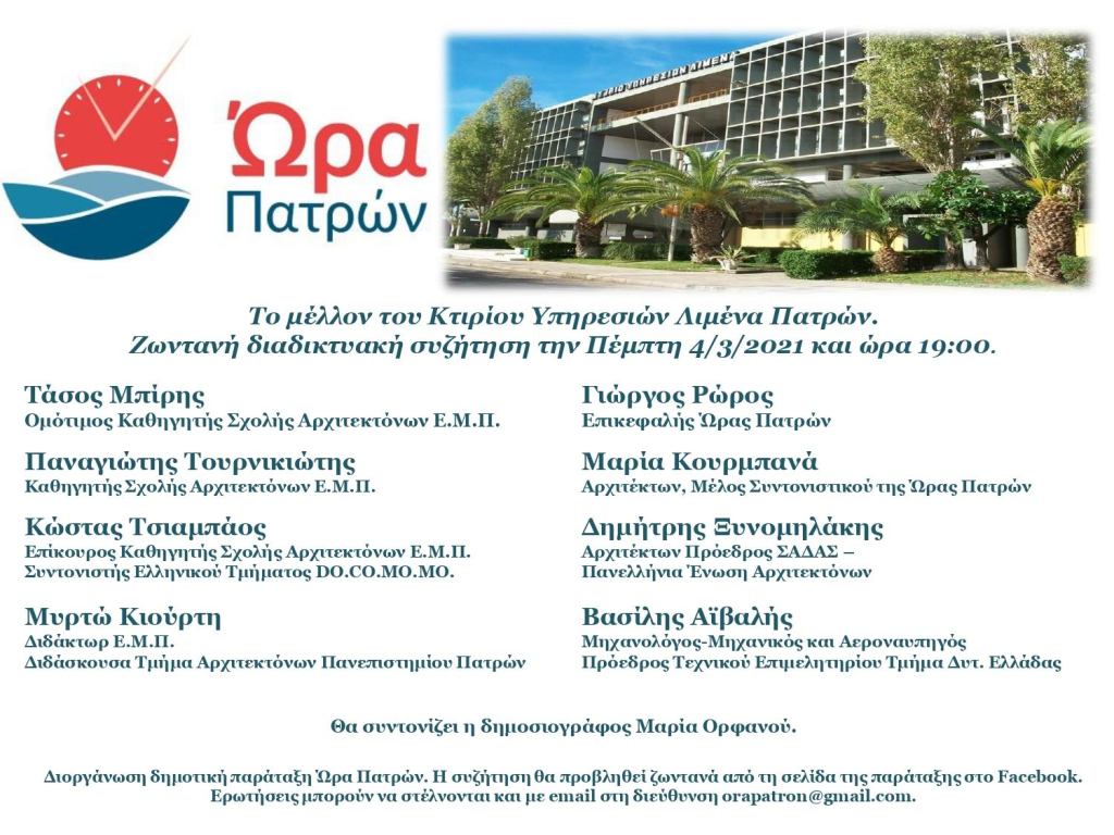 Η Ώρα Πατρών διοργανώνει ζωντανή διαδικτυακή συζήτηση την Πέμπτη 4/3/2021 και ώρα 19:00 για το μέλλον του Κτιρίου Υπηρεσιών Λιμένα Πατρών. Από την Ώρα Πατρών θα παρέμβουν ο επικεφαλής Γιώργος Ρώρος και το μέλος του συντονιστικού Μαρία Κουρμπανά, Αρχιτέκτων.