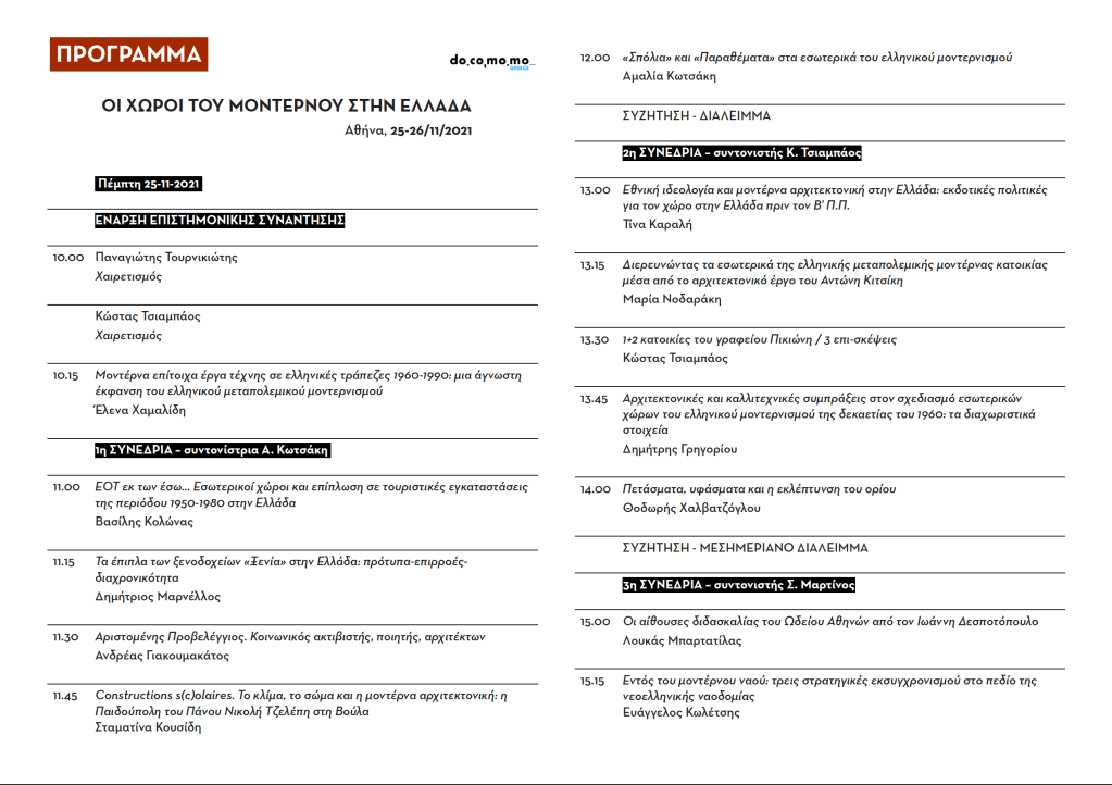 Η επιστημονική συνάντηση του ελληνικού do.co.mo.mo. με θέμα “Η Μοντέρνα Αρχιτεκτονική στην Ελλάδα – Σύγχρονες Κατευθύνσεις” θα έχει ως αντικείμενό της μια σύγχρονη, στοχευμένη και με αφετηρία το παρόν συζήτηση καταστατικού χαρακτήρα με σκοπό την ανάπτυξη νέων προγραμματικών και θεματικών κατευθύνσεων για το ιστορικό φαινόμενο του Μοντέρνου στη χώρα, πάνω σε τρεις προτεινόμενους άξονες: