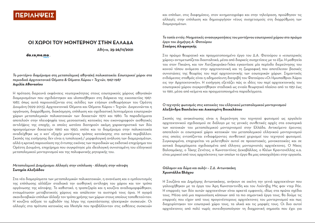 35 χρόνια μετά, με την ευκαιρία της φιλοξενίας της επιστημονικής συνάντησης του do.co.mo.mo Greece στη νεώτερη αρχιτεκτονική σχολή της χώρας, το βασικό ζήτημα που τίθεται είναι το εξής: Ποια είναι η κατάσταση/συνθήκη της μοντέρνας αρχιτεκτονικής κληρονομιάς του μεσοπολέμου και των πρώτων μεταπολεμικών δεκαετιών στην Ελλάδα σήμερα και ποιες νέες κατευθύνσεις στην έρευνα, τη διδασκαλία, την τεκμηρίωση, την προβολή, την προστασία και την επανάχρηση μπορούν να ανατροφοδοτήσουν και να νοηματοδοτήσουν την «ανάγκη» μελέτης του από εδώ και πέρα; Πώς μπορεί να εμπλουτιστεί η μελέτη αυτή στο πλαίσιο νέων ερωτημάτων στο ευρύτερο πεδίο της κριτικής της ιστοριογραφίας και της ιστορίας και θεωρίας της μοντέρνας αρχιτεκτονικής;