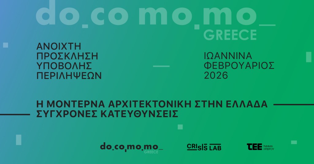 Η επιστημονική συνάντηση του ελληνικού docomomo με θέμα: “Η Μοντέρνα Αρχιτεκτονική στην Ελλάδα – Σύγχρονες Κατευθύνσεις” θα πραγματοποιηθεί στα Ιωάννινα το Σάββατο 28 Φεβρουαρίου και την Κυριακή 1 Μαρτίου. Περισσότερες πληροφορίες για τον χώρο διεξαγωγής και το πρόγραμμα της συνάντησης θα ανακοινωθούν προσεχώς.